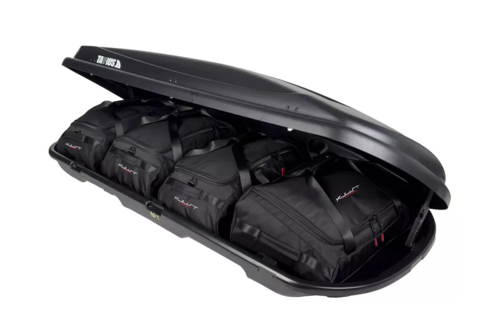 A Kjust utazótáska szett úgy van kialakítva, hogy maximálisan kihasználja a Taurus Xtreme 400 tetőbox helyét. A tetőbox helyét akár 30%-kal hatékonyabban is kihasználhatja, mint különböző méretű utazótáskák és válltáskák használata esetén.